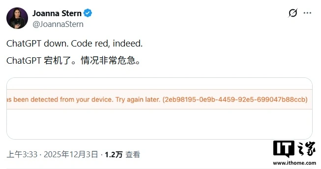 IT之家 12 月 3 日消息,OpenAI 旗下人工智能聊天机器人 ChatGPT 于 12 月 2 日和 3 日接连遭遇服务中断,部分用户无法正常使用。