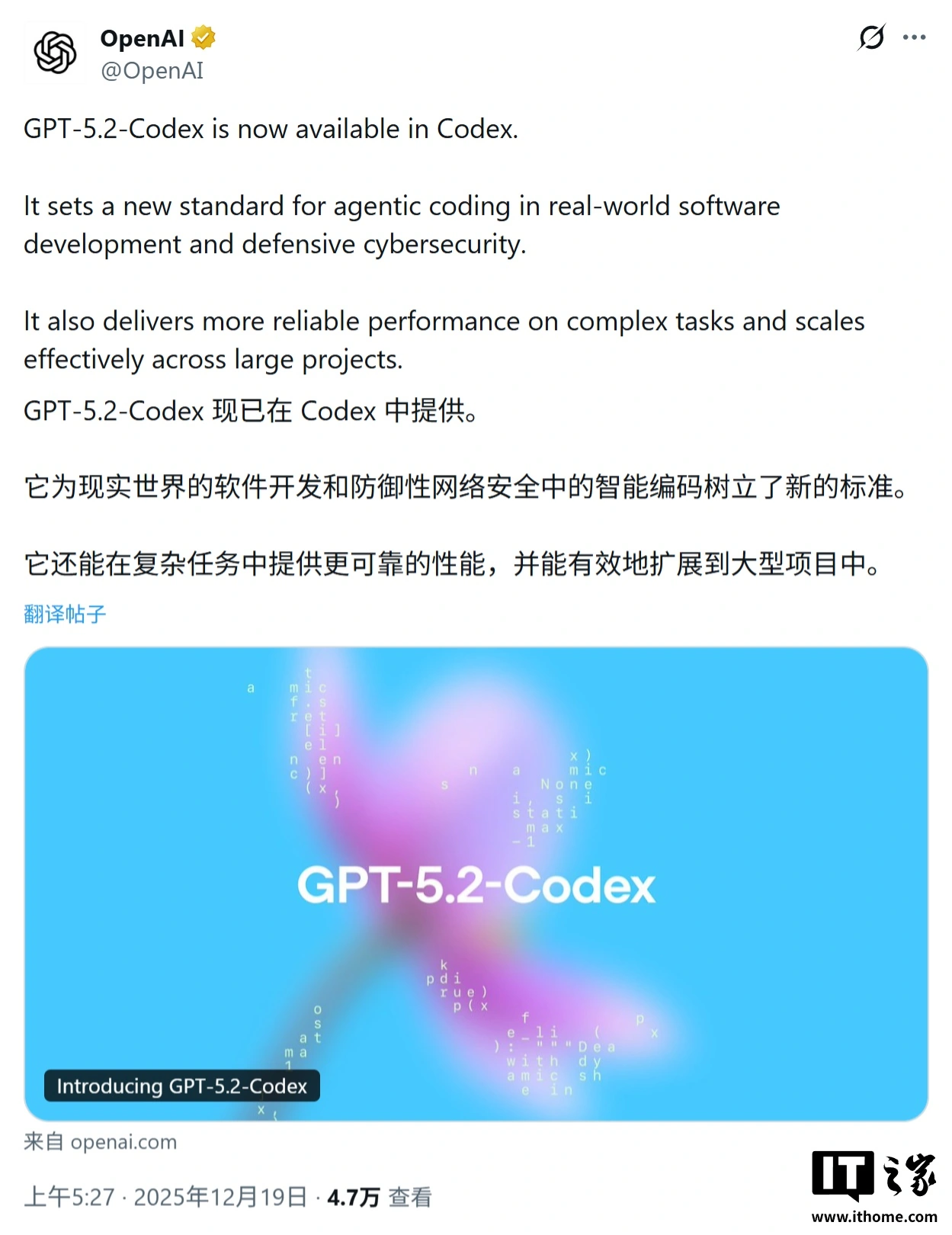 IT之家 12 月 19 日消息,OpenAI 今天(12 月 19 日)发布公告,宣布推出 GPT-5.2-Codex,是其迄今最前沿、最先进的智能体编程 AI 模型,专为解决复杂的现实软件工程问题训练设计。