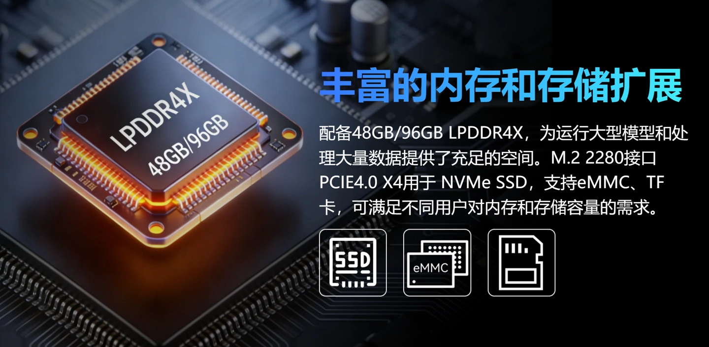 在存储与扩展性方面,AI Station 可选配 48GB 或 96GB 的 LPDDR4X 内存,并支持最高 256GB 的 eMMC 存储、MicroSD 卡以及通过 PCIe 接口连接的 M.2 SSD 固态硬盘。