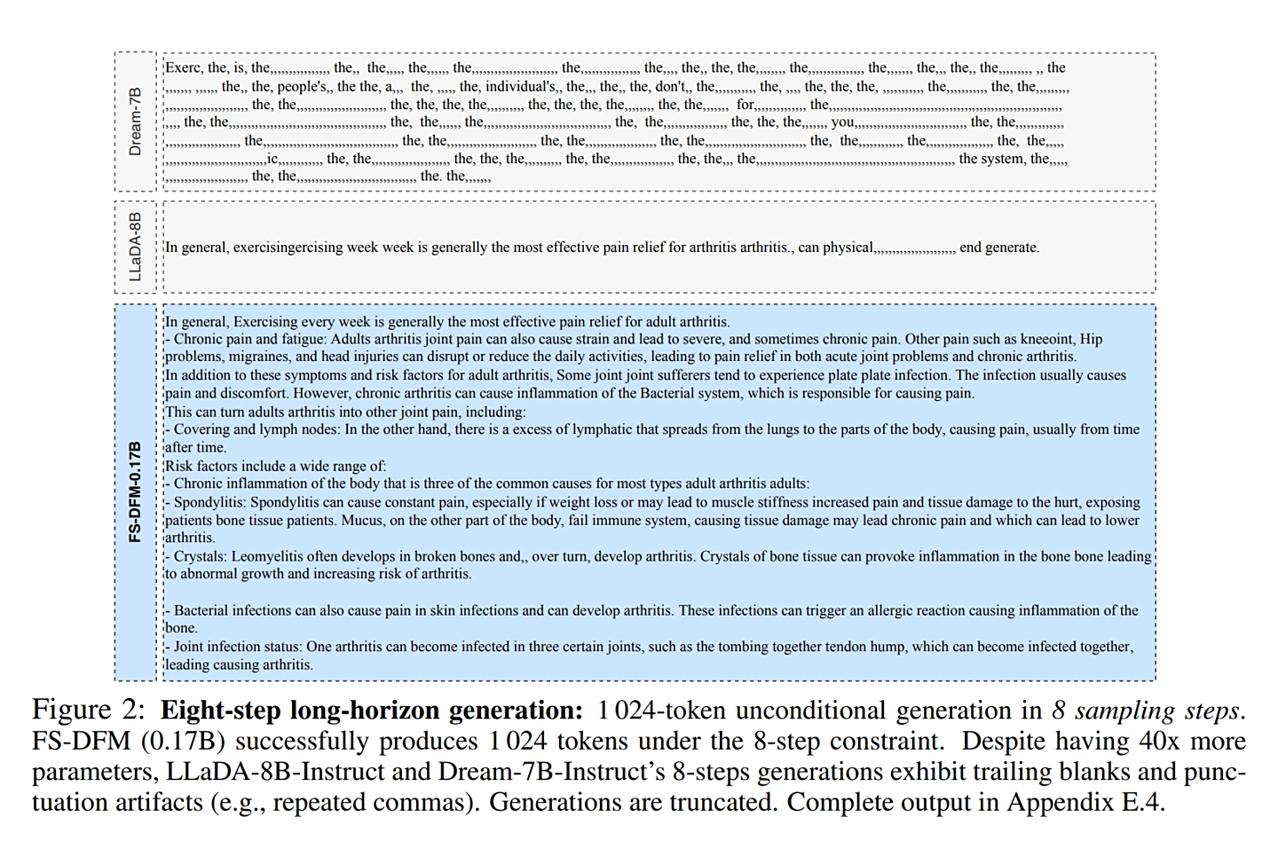 这表明 FS-DFM 在保持极高效率的同时,仍然能保证文本的质量和稳定性。