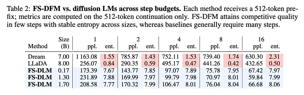 在性能评估中,FS-DFM 与拥有 70 亿参数的 Dream 模型和 80 亿参数的 LLaDA 模型进行了对比。