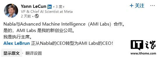“没错,先进机器智能实验室(AMI Labs)是我的新创公司。我担任执行董事长,亚历克斯・勒布伦正从 Nabla 首席执行官调任先进机器智能实验室首席执行官!”杨立昆写道。